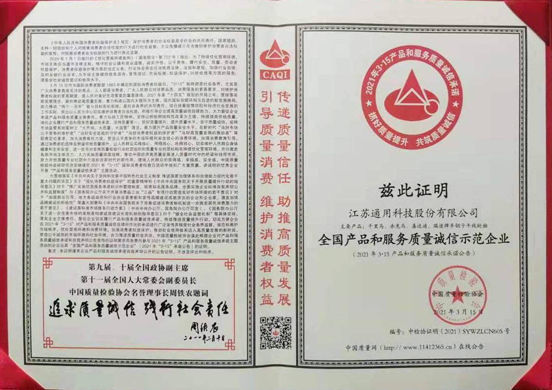近日,在由中國(guó)質(zhì)量檢驗(yàn)協(xié)會(huì)主辦的2021年3·15國(guó)際消費(fèi)者權(quán)益日產(chǎn)品和服務(wù)質(zhì)量誠(chéng)信承諾主題活動(dòng)中,通用股份憑借優(yōu)質(zhì)的產(chǎn)品性能、穩(wěn)