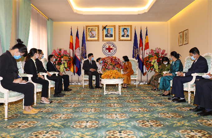 “我謹向您(周海江)致以最衷心的感謝……就如此句所說:‘守望相助,中柬同心’。祝愿您們(紅豆集團)永享佛教四福(長壽、富貴、健康、聰慧)。”翻譯員正在將柬埔寨紅十字會會長、柬埔寨王國首相洪森夫人文拉尼親王的感謝信現(xiàn)場宣讀。