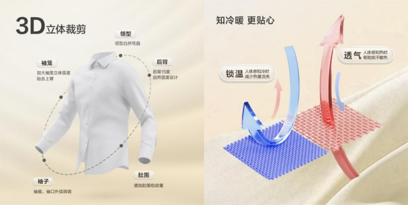 所謂0感,指的是“0壓、0皺、0摩擦、0束縛”。0感舒適襯衫首創(chuàng)紅豆超細旦纖維,輕如羽毛,彈性十足,透氣性極佳,即便炎炎夏日,也能感受到如沐春風般的涼爽與自在。同時,創(chuàng)新運用瑞士HeiQ智能控溫科技,讓面料擁有感知外界溫度并自動調節(jié)的能力,實現(xiàn)“熱縮冷脹”智能溫控效果,在任何環(huán)境下都能保持恰到好處的舒適。